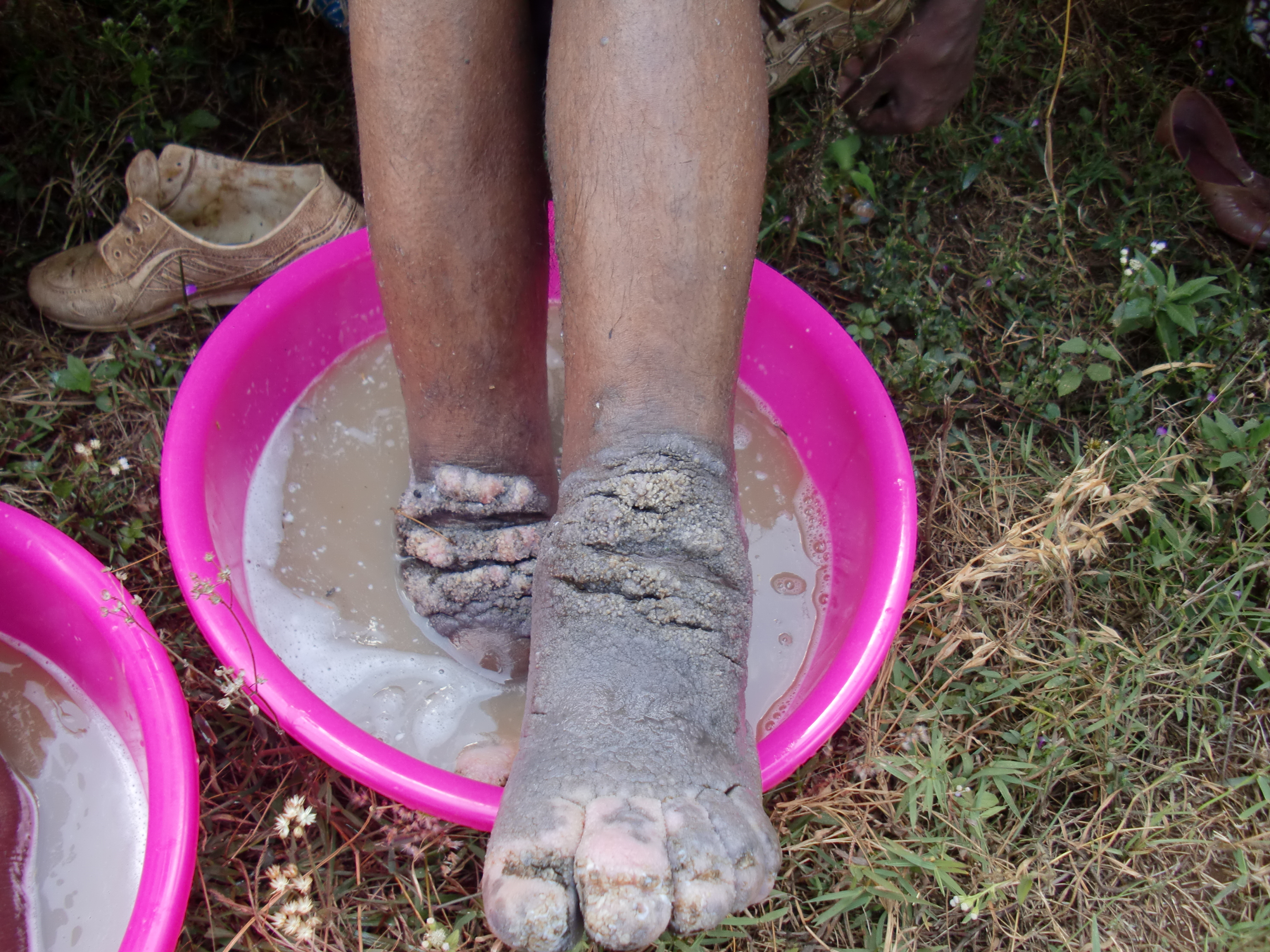 Then they were informed about the causes of their disease: The people listened to banned, When sister Bogalech told them, that it is silicates in the volcanic soil, clog the lymph vessels. Sister Bogalech explained the simple therapy, for which you only have a wash Bowl, SOAP, Neem Oil, Socks and a pair of shoes required.