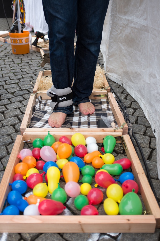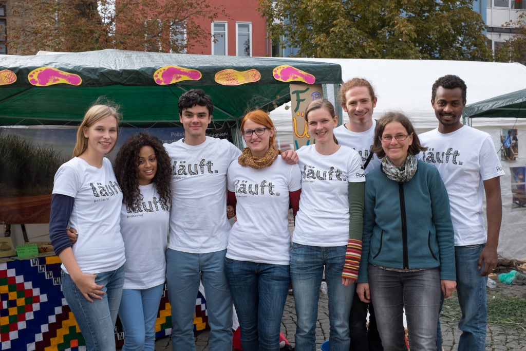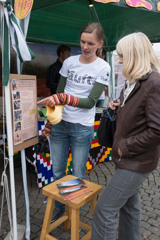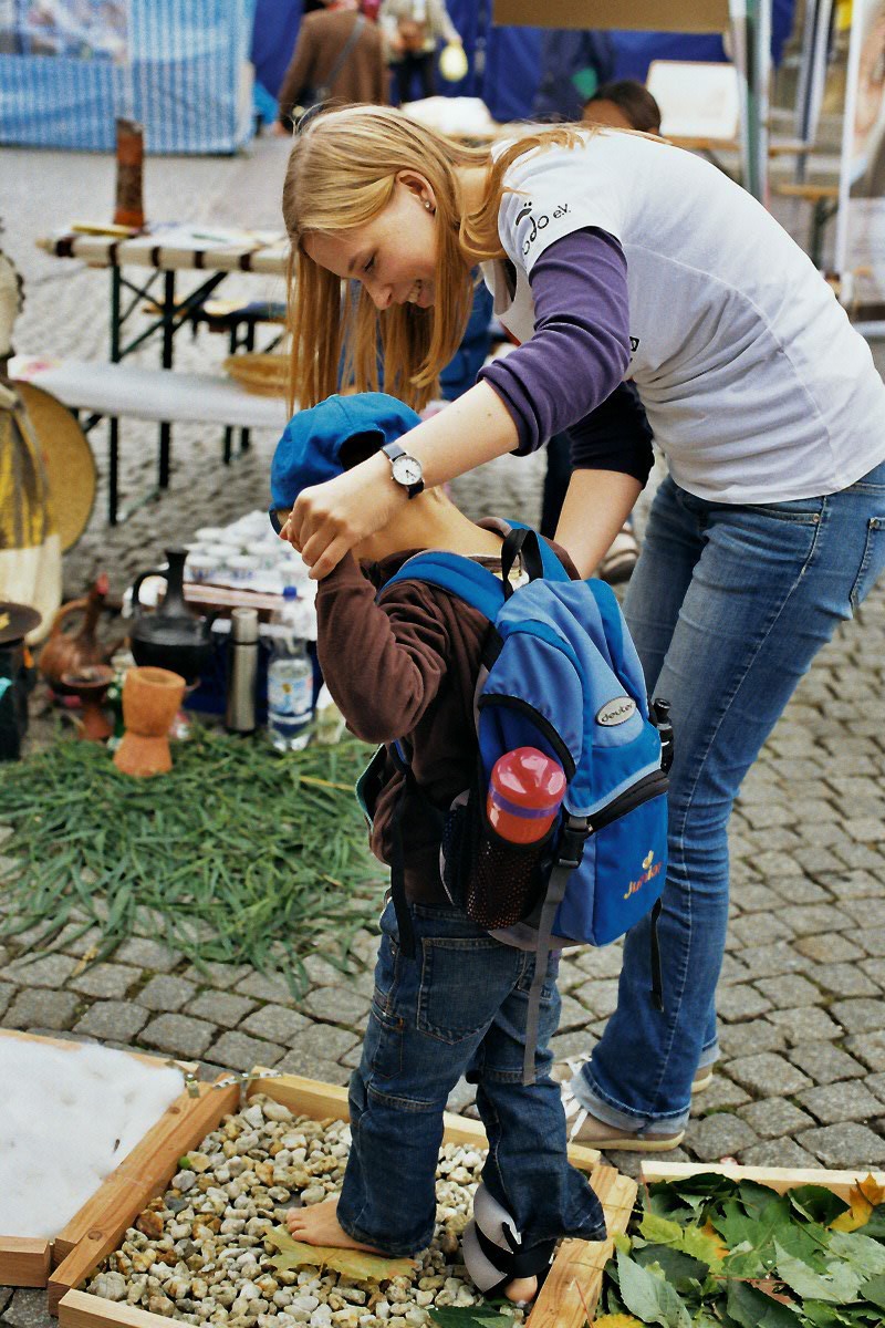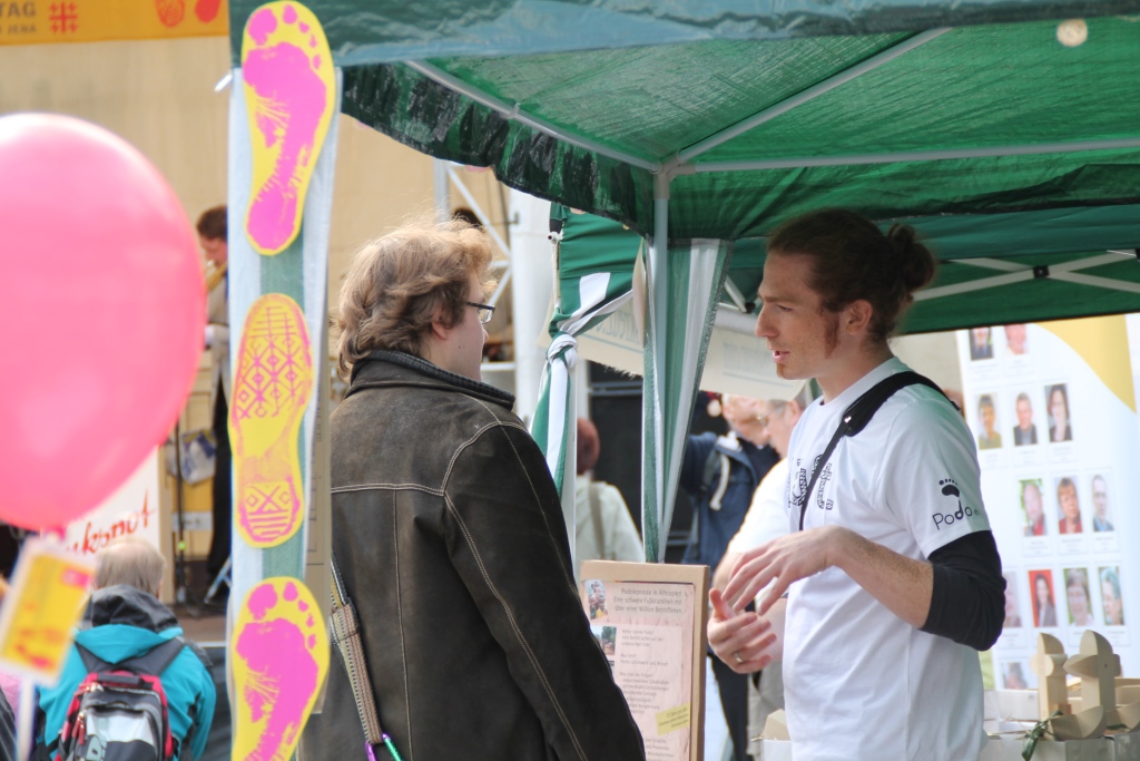 most 22. It was September in Jena, Germany 2. Central German Kirchentag instead and we were represented at the market of opportunities with a status as an association. Among other things, the visitors could, whether small or large, We go through a barefoot path. Despite the somewhat chilly temperatures, you could believe many market visitors to the sense path, Depending on the request with blindfold or could be completed without. Moreover, there was yet a further important accessory: We tied the participants a few foot weights on one foot, to give them a sense of, what it means to move with a z.B.durch Podokoniose of swollen and this heavy foot.